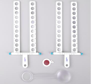4、若燈在線右側,雙眼顯示交叉性復視,證實被測雙眼為外斜或外隱斜,這時將棱鏡排鏡底向內放置在左眼前,由低到高往上推移,詢問被檢查者燈線是否重疊。直到重疊時,記錄棱鏡排鏡上棱鏡的數值,即為外隱斜量。